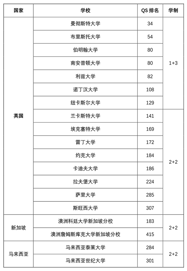 国外学习阶段(3年): 国外对接院校