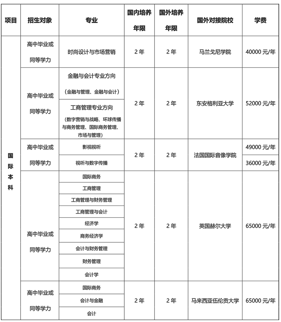 上海纺织工业职工大学国际学院,近年来拓展了诸多优质国际院校的合作,如意大利马兰戈尼学院、英国东安格利亚大学、英国赫尔大学、马来西亚伍伦贡大学、法国法国国际音像学院等学校合作,开展2+2模式的本科学习,让学生在上海纺工大完成一年衔接课程和一年专业课程后,顺利进入外方院校进行后续的本科学习。